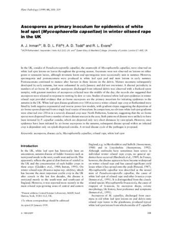 Ascospores as primary inoculum for epidemics of white leaf spot (Mycosphaerella capsellae ) in winter oilseed rape in the UK
