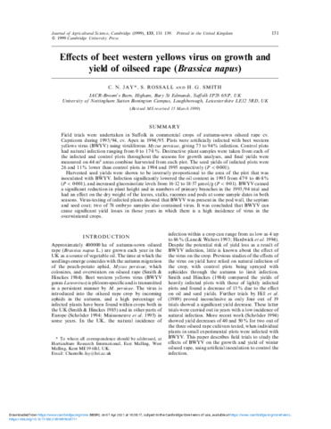 Effects of beet western yellows virus on growth and yield of oilseed rape (Brassica napus ).