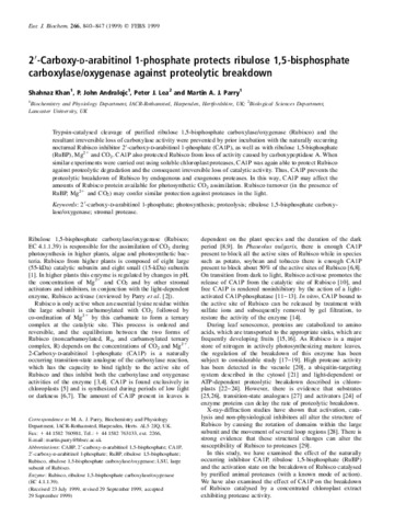 Trypsin-catalysed cleavage of purified ribulose 1,5-bisphosphate carboxylase/oxygenase (Rubisco) and the resultant irreversible loss of carboxylase activity were prevented by prior incubation with the naturally occurring nocturnal Rubisco inhibitor 2'-carboxy-D-arabitinol 1-phosphate (CA1P), as well as with ribulose 1,5-bisphosphate (RuBP, Mg2+ and CO2. CA1P also protected Rubisco from loss of activity caused by carboxypeptidase A. When similar experiments were carried out using soluble chloroplast proteases, CA1P was again able to protect Rubisco against proteolytic degradation and the consequent irreversible loss of catalytic activity. Thus, CA1P prevents the proteolytic breakdown of Rubisco by endogenous and exogenous proteases. In this way, CA1P may affect the amounts of Rubisco protein available for photosynthetic CO2 assimilation. Rubisco turnover tin the presence of RuBP, Mg2+ and CO2) may confer similar protection against proteases in the Light.