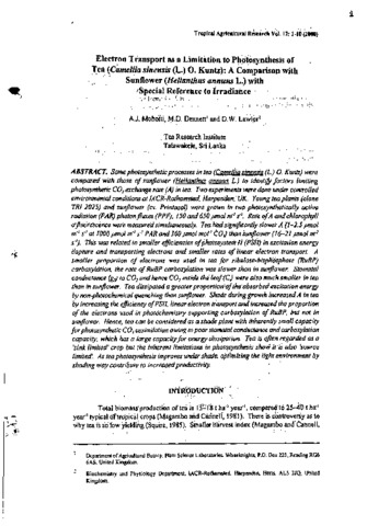 Mohotti, A. J., Dennett, M. D. and Lawlor, David (2000) Electron transport as a limitation to photosynthesis of tea (Camellia sinensis (L.) O. Kuntz): a comparison with sunflower (Helianthus annuus L.) with special reference to irradiance. pp. 1-10.