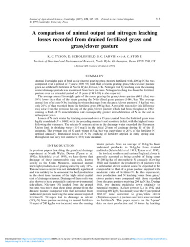 A comparison of animal output and nitrogen leaching losses recorded from drained fertilized grass and grass/clover pasture