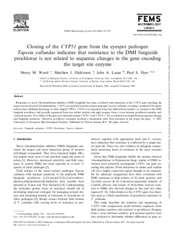 Cloning of the CYP51 gene from the eyespot pathogen Tapesia yallundae indicates that resistance to the DMI fungicide prochloraz is not related to sequence changes in the gene encoding the target site enzyme.