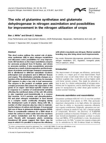 The role of glutamine synthetase and glutamate dehydrogenase in nitrogen assimilation and possibilities for improvement in the nitrogen utilization of crops.