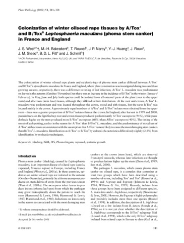 Colonization of winter oilseed rape tissues by A/Tox+ and B/Tox0 Leptosphaeria maculans (phoma stem canker) in France and England