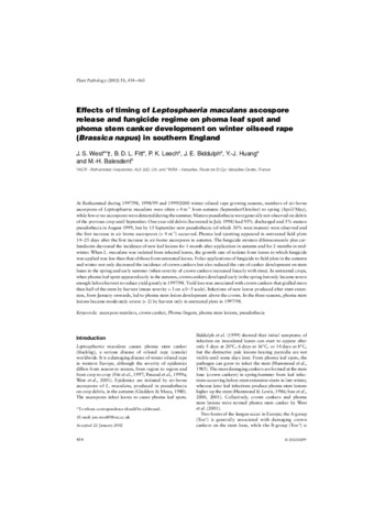 At Rothamsted during 1997/98, 1998/99 and 1999/2000 winter oilseed rape growing seasons, numbers of air-borne ascospores of Leptosphaeria maculans were often > 4 m(-3) from autumn (September/October) to spring (April/May), while few or no ascospores were detected during the summer. Mature pseudothecia were generally not observed on debris of the previous crop until September. One-year-old debris (harvested in July 1998) had 95% discharged and 5% mature pseudothecia in August 1999, but by 15 September new pseudothecia (of which 30% were mature) were observed and the first increase in air-borne ascospores (> 4 m(-3) ) occurred. Phoma leaf spotting appeared in untreated field plots 14-25 days after the first increase in air-borne ascospores in autumn. The fungicide mixture difenoconazole plus carbendazim decreased the incidence of new leaf lesions for 1 month after application in autumn and for 2 months in mid-winter. When L. maculans was isolated from infected leaves, the growth rate of isolates from leaves to which fungicide was applied was less than that of those from untreated leaves. Foliar applications of fungicide to field plots in the autumn and winter not only decreased the incidence of crown cankers but also reduced the rate of canker development on stem bases in the spring and early summer (when severity of crown cankers increased linearly with time). In untreated crops, when phoma leaf spots appeared early in the autumn, crown cankers developed early in the spring but only became severe enough before harvest to reduce yield greatly in 1997/98. Yield loss was associated with crown cankers that girdled more than half of the stem by harvest (mean severity > 3 on a 0-5 scale). Infections of new leaves produced after stem extension, from January onwards, led to phoma stem lesion development above the crown. In the three seasons, phoma stem lesions became moderately severe (> 2) by harvest only in untreated plots in 1997/98.