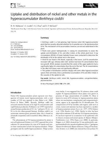 Uptake and distribution of nickel and other metals in the hyperaccumulator Berkheya coddii