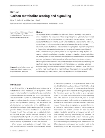 The regulation of carbon metabolism in plant cells responds sensitively to the levels of carbon metabolites that are available. The sensing and signalling systems that are involved in this process form a complex web that comprises metabolites, transporters, enzymes, transcription factors and hormones. Exactly which metabolites are sensed is not yet known, but candidates include sucrose, glucose and other hexoses, glucose-6-phosphate, trehalose-6-phosphate, trehalose and adenosine monophosphate. Important components of the signalling pathways include sucrose non-fermenting-1-related protein kinase-1 (SnRK1) and hexokinase; sugar transporters are also implicated. A battery of genes and enzymes involved in carbohydrate metabolism, secondary metabolism, nitrogen assimilation and photosynthesis are under the control of these pathways and fundamental developmental processes such as germination, sprouting, pollen development and senescence are affected by them. Here we review the current knowledge of carbon metabolite sensing and signalling in plants, drawing comparisons with homologous and analogous systems in animals and fungi. We also review the evidence for cross-talk between carbon metabolite and other major signalling systems in plant cells and the prospects for manipulating this fundamentally important aspect of metabolic regulation for crop improvement.