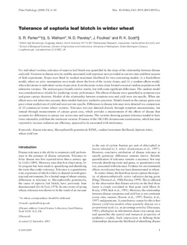 For individual varieties, tolerance of septoria leaf blotch was quantified by the slope of the relationship between disease and yield. Variation in disease severity and the associated yield responses were provided across two sites and three seasons of field experiments. Slopes were fitted by residual maximum likelihood for two contrasting models: (i) a fixed-effects model, where no prior assumptions were made about the form of the variety slopes; and (ii) a random-effects model, where deviations in individual variety slopes away from the mean variety slope formed a normal random population with unknown variance. The analyses gave broadly similar results, but with some significant differences. The random model was considered more reliable for predicting variety performance. The effects of disease were quantified as symptom area and green canopy duration. Models of the relationship between symptom area and yield were site-specific. When site effects were not taken into account, these models had poor predictive precision. Models based on the canopy green area gave robust predictions of yield and were not site-specific. Differences in disease tolerance were detected in a comparison of 25 commercial winter wheat varieties. Tolerance was not detected directly through symptom measurements, but instead through measurements of canopy green area, which provides a measurement of the effects of disease that accounts for differences in canopy size across sites and seasons. The varieties showing greatest tolerance tended to have lower attainable yield than the intolerant varieties. Presence of the 1BL/1RS chromosome translocation, which has been reported to increase radiation use efficiency, appeared to be associated with intolerance.