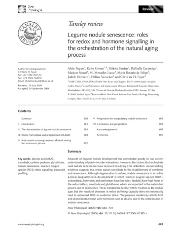 Research on legume nodule development has contributed greatly to our current understanding of plant-microbe interactions. However, the factors that orchestrate root nodule senescence have received relatively little attention. Accumulating evidence suggests that redox signals contribute to the establishment of symbiosis and senescence. Although degenerative in nature, nodule senescence is an active process programmed in development in which reactive oxygen species (ROS), antioxidants, hormones and proteinases have key roles. Nodules have high levels of the redox buffers, ascorbate and glutathione, which are important in the nodulation process and in senescence. These metabolites decline with N-fixation as the nodule ages but the resultant decrease in redox buffering capacity does not necessarily lead to enhanced ROS or oxidative stress. We propose models by which ROS and antioxidants interact with hormones such as abscisic acid in the orchestration of nodule senescence.