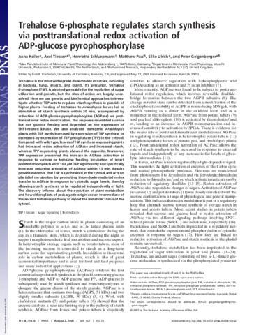 Trehalose 6-phosphate regulates starch synthesis via posttranslational redox activation of ADP-glucose pyrophosphorylase.