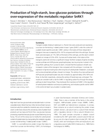 Production of high-starch, low-glucose potatoes through over-expression of the metabolic regulator SnRK1
