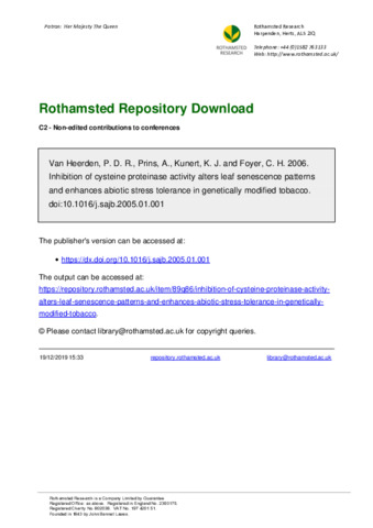 Inhibition of cysteine proteinase activity alters leaf senescence patterns and enhances abiotic stress tolerance in genetically modified tobacco.