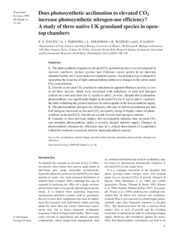 Does photosynthetic acclimation to elevated CO2 increase photosynthetic nitrogen-use efficiency? A study of three native UK grassland species in open-top chambers.