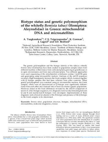 Biotype status and genetic polymorphism of the whitefly Bemisia tabaci (Hemiptera: Aleyrodidae) in Greece: mitochondrial DNA and microsatellites.