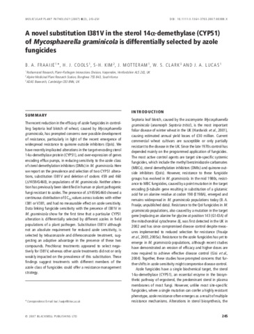 A novel substitution 1381V in the sterol 14alpha-demethylase (CYP51) of Mycosphaerella graminicola is differentially selected by azole fungicides