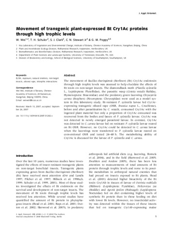 | Additional information | [Wei, W.] Chinese Acad Sci, Inst Bot, Key Lab Vegetat & Environm Change, Beijing 100093, Peoples R China; [Wei, W.; Schuler, T. H.; Poppy, G. M.] Rothamsted Res, Plant & Invertebrate Ecol Div, Harpenden, Herts, England; [Clark, S. J.] Rothamsted Res, Biomath & Bioinformat Div, Harpenden, Herts, England; [Stewart, C. N., Jr.] Univ Tennessee, Dept Plant Sci & Landscape Syst, Knoxville, TN USA; [Poppy, G. M.] Univ Southampton, Sch Biol Sci, Div Biodiversity & Ecol, Southampton, Hants, England |