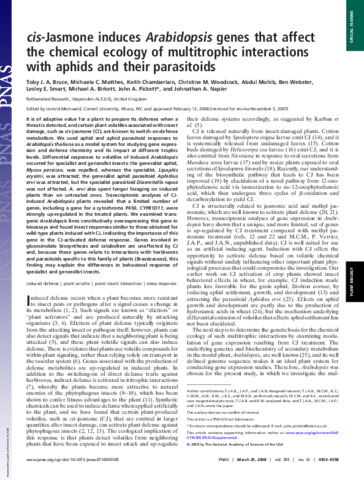 cis- Jasmone induces Arabidopsis genes that affect the chemical ecology of multitrophic interactions with aphids and their parasitoids.