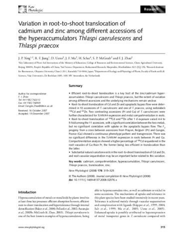 Variation in root-to-shoot translocation of cadmium and zinc among different accessions of the hyperaccumulators Thlaspi caerulescens and Thlaspi praecox