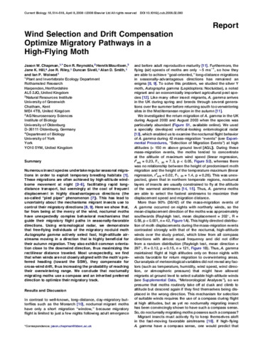 Numerous insect species undertake regular seasonal migrations in order to exploit temporary breeding habitats [1]. These migrations are often achieved by high-altitude windborne movement at night [2, 3, 4, 5, 6], facilitating rapid long-distance transport, but seemingly at the cost of frequent displacement in highly disadvantageous directions (the so-called “pied piper” phenomenon [7]). This has lead to uncertainty about the mechanisms migrant insects use to control their migratory directions [8, 9]. Here we show that, far from being at the mercy of the wind, nocturnal moths have unexpectedly complex behavioral mechanisms that guide their migratory flight paths in seasonally-favorable directions. Using entomological radar, we demonstrate that free-flying individuals of the migratory noctuid moth Autographa gamma actively select fast, high-altitude airstreams moving in a direction that is highly beneficial for their autumn migration. They also exhibit common orientation close to the downwind direction, thus maximizing the rectilinear distance traveled. Most unexpectedly, we find that when winds are not closely aligned with the moth's preferred heading (toward the SSW), they compensate for cross-wind drift, thus increasing the probability of reaching their overwintering range. We conclude that nocturnally migrating moths use a compass and an inherited preferred direction to optimize their migratory track.