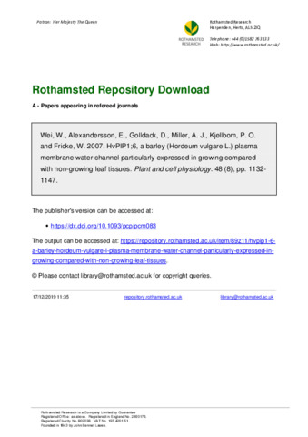 HvPIP1;6, a barley (Hordeum vulgare L.) plasma membrane water channel particularly expressed in growing compared with non-growing leaf tissues.
