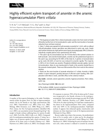 Highly efficient xylem transport of arsenite in the arsenic hyperaccumulator Pteris vittata