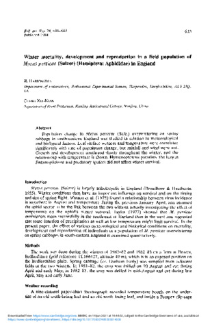 Winter mortality, development and reproduction in a field population of Myzus persicae (Sulzer) (Hemiptera: Aphididae) in England