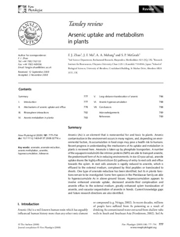 | Additional information | Ministry of Agriculture, Forestry and Fisheries of Japan [IPG-0006] ; Ministry of Education, Culture, Sports, Science and Technology of Japan [17078008] [Zhao, F. J.; McGrath, S. P.] Rothamsted Res, Dept Soil Sci, Harpenden AL5 2JQ, Herts, England; [Ma, J. F.] Okayama Univ, Res Inst Bioresources, Kurashiki, Okayama 7100046, Japan; [Meharg, A. A.] Univ Aberdeen, Sch Biol Sci, Aberdeen AB24 3UU, Scotland |