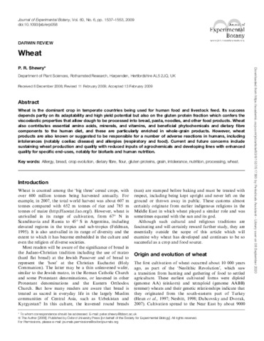 Wheat is the dominant crop in temperate countries being used for human food and livestock feed. Its success depends partly on its adaptability and high yield potential but also on the gluten protein fraction which confers the viscoelastic properties that allow dough to be processed into bread, pasta, noodles, and other food products. Wheat also contributes essential amino acids, minerals, and vitamins, and beneficial phytochemicals and dietary fibre components to the human diet, and these are particularly enriched in whole-grain products. However, wheat products are also known or suggested to be responsible for a number of adverse reactions in humans, including intolerances (notably coeliac disease) and allergies (respiratory and food). Current and future concerns include sustaining wheat production and quality with reduced inputs of agrochemicals and developing lines with enhanced quality for specific end-uses, notably for biofuels and human nutrition.