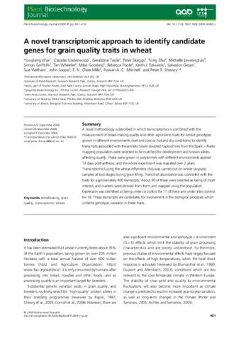 | Additional information | [Wan, Yongfang; Underwood, Claudia; Gezan, Salvador; Welham, Sue; Mitchell, Rowan A. C.; Shewry, Peter R.] Rothamsted Res, Harpenden AL5 2JQ, Herts, England; [Toole, Geraldine; Mills, E. N. Clare] Inst Food Res, Inst Food Res, Norwich NR4 7UA, Norfolk, England; [Skeggs, Peter] Hovis, Lord Rank Ctr, High Wycombe HP12 3QR, Bucks, England; [Zhu, Tong] Syngenta Biotechnol Inc, Res Triangle Pk, NC 27709 USA; [Leverington, Michelle; Griffiths, Simon; Snape, John] John Innes Inst, Norwich NR4 7UH, Norfolk, England; [Wheeler, Tim; Gooding, Mike; Poole, Rebecca] Univ Reading, Reading RG6 6AR, Berks, England; [Edwards, Keith J.] Univ Bristol, Bristol BS8 1UG, Avon, England |