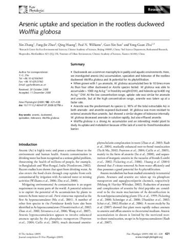 Duckweeds are a common macrophyte in paddy and aquatic environments. Here, we investigated arsenic (As) accumulation, speciation and tolerance of the rootless duckweed Wolffia globosa and its potential for As phytofiltration. When grown with 1 mu M arsenate, W. globosa accumulated two to 10 times more As than four other duckweed or Azolla species tested. W. globosa was able to accumulate > 1000 mg As kg(-1) in frond dry weight (DW), and tolerate up to 400 mg As kg-1 DW. At the low concentration range, uptake rate was similar for arsenate and arsenite, but at the high concentration range, arsenite was taken up at a faster rate. Arsenite was the predominant As species (c. 90% of the total extractable As) in both arsenate-and arsenite-exposed duckweed. W. globosa was more resistant to external arsenate than arsenite, but showed a similar degree of tolerance internally. W. globosa decreased arsenate in solution rapidly, but also effluxed arsenite. Wolffia globosa is a strong As accumulator and an interesting model plant to study As uptake and metabolism because of the lack of a root-to-frond translocation