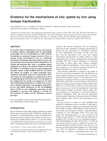 | Additional information | [Kirk, Guy J. D.] Cranfield Univ, Natl Soil Resources Inst, Cranfield MK43 0AL, Beds, England; [Arnold, Tim; Mason, Thomas F. D.; Weiss, Dominik J.] Univ London Imperial Coll Sci Technol & Med, Dept Earth Sci & Engn, London SW7 2AZ, England; [Wissuwa, Matthias; Frei, Michael] JIRCAS, Crop Prod & Environm Div, Tsukuba, Ibaraki 3058686, Japan; [Zhao, Fang-Jie] Rothamsted Res, Harpenden AL5 2JQ, Herts, England; [Weiss, Dominik J.] Nat Hist Museum, London SW7 5PD, England |