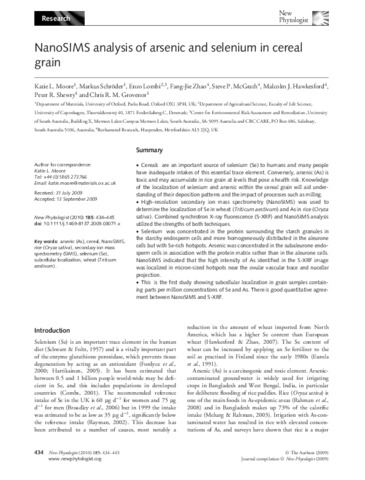 | Additional information | [Moore, Katie L.; Schroder, Markus; Grovenor, Chris R. M.] Univ Oxford, Dept Mat, Oxford OX1 3PH, England; [Lombi, Enzo] Univ Copenhagen, Fac Life Sci, Dept Agr Sci, DK-1871 Frederiksberg C, Denmark; [Lombi, Enzo] Univ S Australia, Ctr Environm Risk Assessment & Remediat, Adelaide, SA 5095, Australia; [Lombi, Enzo] CRC CARE, Salisbury, SA 5106, Australia; [Zhao, Fang-Jie; McGrath, Steve P.; Hawkesford, Malcolm J.; Shewry, Peter R.] Rothamsted Res, Harpenden AL5 2JQ, Herts, England |