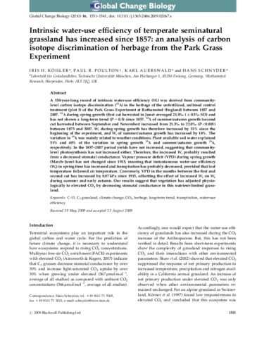 Intrinsic water-use efficiency of temperate seminatural grassland has increased since 1857: an analysis of carbon isotope discrimination of herbage from the Park Grass Experiment