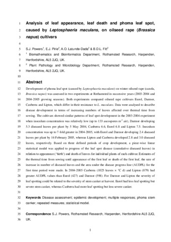 Analysis of leaf appearance, leaf death and phoma leaf spot, caused by Leptosphaeria maculans, on oilseed rape (Brassica napus) cultivars