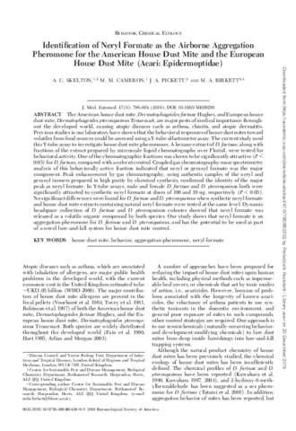 Identification of neryl formate as the airborne aggregation pheromone for the American house dust mite and the European house dust mite (Acari: Epidermoptidae).