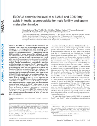 ELVOVL2 controls the level of n-6 28:5 and 30:5 fatty acids in testis, a prerequisite for male fertility and sperm maturation in mice.