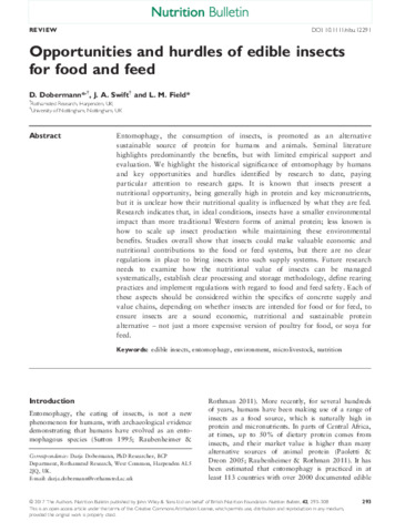 Entomophagy, the consumption of insects, is promoted as an alternative sustainable source of protein for humans and animals. Seminal literature highlights predominantly the benefits, but with limited empirical support and evaluation. We highlight the historical significance of entomophagy by humans and key opportunities and hurdles identified by research to date, paying particular attention to research gaps. It is known that insects present a nutritional opportunity, being generally high in protein and key micronutrients, but it is unclear how their nutritional quality is influenced by what they are fed. Research indicates that, in ideal conditions, insects have a smaller environmental impact than more traditional Western forms of animal protein; less known is how to scale up insect production while maintaining these environmental benefits. Studies overall show that insects could make valuable economic and nutritional contributions to the food or feed systems, but there are no clear regulations in place to bring insects into such supply systems. Future research needs to examine how the nutritional value of insects can be managed systematically, establish clear processing and storage methodology, define rearing practices and implement regulations with regard to food and feed safety. Each of these aspects should be considered within the specifics of concrete supply and value chains, depending on whether insects are intended for food or for feed, to ensure insects are a sound economic, nutritional and sustainable protein alternative – not just a more expensive version of poultry for food, or soya for feed.