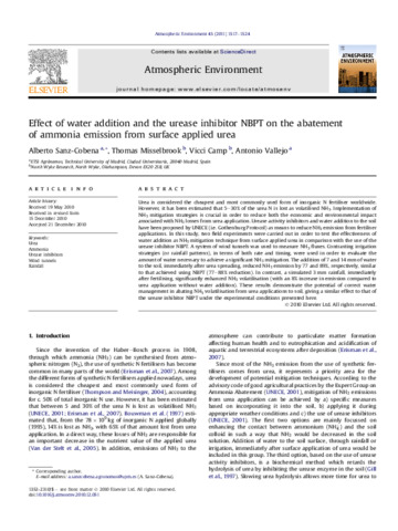 Effect of water addition and the urease inhibitor NBPT on the abatement of ammonia emission from surface applied urea.