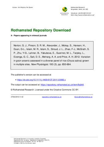 | Additional information | [Norton, Gareth J.; Alexander, Jill; Mckay, Susan; Hansen, Helle; Meharg, Andrew A.; Price, Adam H.] Univ Aberdeen, Inst Biol & Environm Sci, Aberdeen AB24 3UU, Scotland; [Pinson, Shannon R. M.] ARS, USDA, Rice Res Unit, Beaumont, TX 77713 USA; [Duan, Gui-Lan; Zhu, Yong-Guan] Chinese Acad Sci, Res Ctr Ecoenvironm Sci, Beijing 100085, Peoples R China; [Islam, M. Rafiqul; Islam, Shofiqul] Bangladesh Agr Univ, Dept Soil Sci, Mymensingh 2202, Bangladesh; [Stroud, Jacqueline L.; Zhao, Fang-Jie; McGrath, Steve P.] Rothamsted Res, Dept Soil Sci, Harpenden AL5 2JQ, Herts, England; [Lahner, Brett; Yakubova, Elena; Salt, David E.] Purdue Univ, Dept Hort & Landscape Architecture, W Lafayette, IN 47906 USA; [Guerinot, Mary Lou] Dartmouth Coll, Dept Biol Sci, Hanover, NH 03755 USA; [Tarpley, Lee] Texas A&M Syst AgriLife Res Ctr, Beaumont, TX 77713 USA; [Eizenga, Georgia C.] ARS, USDA, Dale Bumpers Natl Rice Res Ctr, Stuttgart, AR 72160 USA |