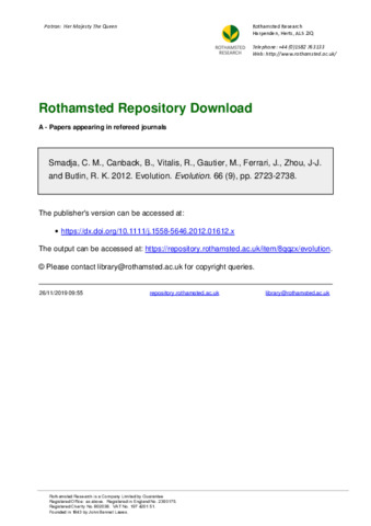 | Additional information | [Smadja, Carole M.] Univ Montpellier 2, CNRS, Inst Sci Evolut, UMR 5554, F-34095 Montpellier, France; [Canback, Bjorn] Lund Univ, Dept Biol, SE-22362 Lund, Sweden; [Vitalis, Renaud] INRA IRD CIRAD Montpellier SupAgro, Inst Natl Rech Agron, Ctr Natl Rech Sci, UMR CBGP, F-34988 Montferrier Sur Lez, France; [Ferrari, Julia] Univ York, Dept Biol, York YO10 5DD, N Yorkshire, England; [Zhou, Jing-Jiang] Rothamsted Res, BBSCR, Dept Biol Chem, Harpenden AL5 2JQ, Herts, England; [Butlin, Roger K.] Univ Sheffield, Sheffield S10 2TN, S Yorkshire, England |
