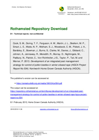 Development of an integrated pest management strategy for control of pollen beetles in winter oilseed rape (HGCA Project Report No 504)
