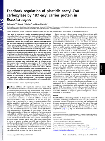 Feedback regulation of plastidic acetyl-CoA carboxylase by 18:1-acyl carrier protein in Brassica napus.