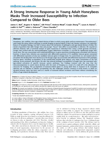A strong immune response in young adult honeybees masks their increased susceptibility to infection compared to older bees.