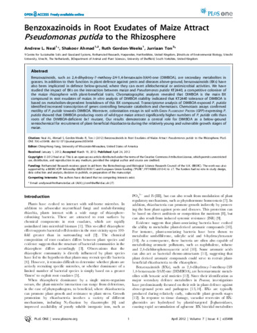 Benzoxazinoids in root exudates of maize attract Pseudomonas putida to the rhizosphere.