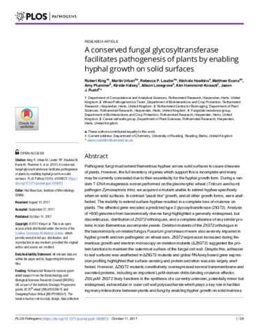 Pathogenic fungi must extend filamentous hyphae across solid surfaces to cause diseases of plants. However, the full inventory of genes which support this is incomplete and many may be currently concealed due to their essentiality for the hyphal growth form. During a random T-DNA mutagenesis screen performed on the pleomorphic wheat (Triticum aestivum) pathogen Zymoseptoria tritici, we acquired a mutant unable to extend hyphae specifically when on solid surfaces. In contrast "yeast-like" growth, and all other growth forms, were unaffected. The inability to extend surface hyphae resulted in a complete loss of virulence on plants. The affected gene encoded a predicted type 2 glycosyltransferase (ZtGT2). Analysis of >800 genomes from taxonomically diverse fungi highlighted a generally widespread, but discontinuous, distribution of ZtGT2 orthologues, and a complete absence of any similar proteins in non-filamentous ascomycete yeasts. Deletion mutants of the ZtGT2 orthologue in the taxonomically un-related fungus Fusarium graminearum were also severely impaired in hyphal growth and non-pathogenic on wheat ears. ZtGT2 expression increased during filamentous growth and electron microscopy on deletion mutants (ΔZtGT2) suggested the protein functions to maintain the outermost surface of the fungal cell wall. Despite this, adhesion to leaf surfaces was unaffected in ΔZtGT2 mutants and global RNAseq-based gene expression profiling highlighted that surface-sensing and protein secretion was also largely unaffected. However, ΔZtGT2 mutants constitutively overexpressed several transmembrane and secreted proteins, including an important LysM-domain chitin-binding virulence effector, Zt3LysM. ZtGT2 likely functions in the synthesis of a currently unknown, potentially minor but widespread, extracellular or outer cell wall polysaccharide which plays a key role in facilitating many interactions between plants and fungi by enabling hyphal growth on solid matrices.