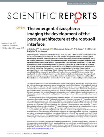 The rhizosphere is the zone of soil influenced by a plant root and is critical for plant health and nutrient acquisition. All below ground resources must pass through this dynamic zone prior to their capture by plant roots. However, researching the undisturbed rhizosphere has proved very challenging. Here we compare the temporal changes to the intact rhizosphere pore structure during the emergence of a developing root system in different soils. High resolution X-ray Computed Tomography (CT) was used to quantify the impact of root development on soil structural change, at scales relevant to individual micro-pores and aggregates (μm). A comparison of micro-scale structural evolution in homogenously packed soils highlighted the impacts of a penetrating root system in changing the surrounding porous architecture and morphology. Results indicate the structural zone of influence of a root can be more localised than previously reported (μm scale rather than mm scale). With time, growing roots significantly alter the soil physical environment in their immediate vicinity through reducing root-soil contact and crucially increasing porosity at the root-soil interface and not the converse as has often been postulated. This ‘rhizosphere pore structure’ and its impact on associated dynamics are discussed.