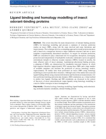 This review describes the main characteristics of odorant-binding proteins (OBPs) for homology modelling and presents a summary of structure prediction studies on insect OBPs, along with the steps involved and some limitations and improvements. The technique involves a computing approach to model protein structures and is based on a comparison between a target (unknown structure) and one or more templates (experimentally determined structures). As targets for structure prediction, OBPs are considered to play a functional role for recognition, desorption, scavenging, protection and transportation of hydrophobic molecules (odourants) across an aqueous environment (lymph) to olfactory receptor neurones (ORNs) located in sensilla, the main olfactory units of insect antennae. Lepidopteran pheromone-binding proteins, a subgroup of OBPs, are characterized by remarkable structural features, in which high sequence identities (approximately 30%) among these OBPs and a large number of available templates can facilitate the prediction of precise homology models. Approximately 30 studies have been performed on insect OBPs using homology modelling as a tool to predict their structures. Although some of the studies have assessed ligand-binding affinity using structural information and biochemical measurements, few have performed docking and molecular dynamic (MD) simulations as a virtual method to predict best ligands. Docking and MD simulations are discussed in the context of discovery of novel semiochemicals (super-ligands) using homology modelling to conceive further strategies in insect management.