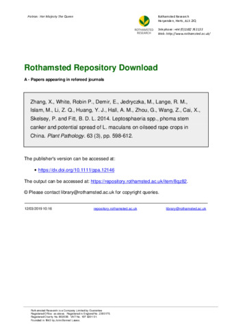 | Additional information | [Zhang, X.; Demir, E.; Huang, Y. J.; Hall, A. M.; Fitt, B. D. L.] Univ Hertfordshire, Hatfield AL10 9AB, Herts, England; [Zhang, X.] Chongqing Normal Univ, Elementary Educ Coll, Chongqing 400700, Peoples R China; [Zhang, X.] Southwest Univ, Chongqing 400715, Peoples R China; [White, R. P.] Rothamsted Res, Harpenden AL5 2JQ, Herts, England; [Jedryczka, M.] Polish Acad Sci, Inst Plant Genet, PL-60479 Poznan, Poland; [Lange, R. M.] Alberta Innovates Technol Futures, Vegreville, AB T9C 1T4, Canada; [Islam, M.] Univ Westminster, London W1W 6UW, England; [Li, Z. Q.] Inner Mongolia Acad Agr & Anim Husb Sci, Hohhot 010031, Inner Mongolia, Peoples R China; [Zhou, G.] Shanghai Entry Exit Inspect & Quarantine Bur, Shanghai 200135, Peoples R China; [Wang, Z.] Hubei Entry Exit Inspect & Quarantine Bur, Wuhan 430050, Hubei, Peoples R China; [Cai, X.] Huazhong Agr Univ, Wuhan 430070, Hubei, Peoples R China; [Skelsey, P.] James Hutton Inst, Dundee DD2 5DA, Scotland |