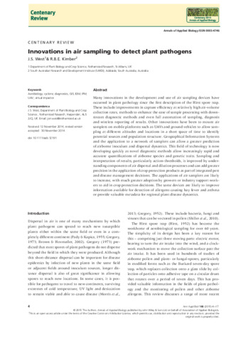 Many innovations in the development and use of air sampling devices have occurred in plant pathology since the first description of the Hirst spore trap. These include improvements in capture efficiency at relatively high air-volume collection rates, methods to enhance the ease of sample processing with downstream diagnostic methods and even full automation of sampling, diagnosis and wireless reporting of results. Other innovations have been to mount air samplers on mobile platforms such as UAVs and ground vehicles to allow sampling at different altitudes and locations in a short space of time to identify potential sources and population structure. Geographical Information Systems and the application to a network of samplers can allow a greater prediction of airborne inoculum and dispersal dynamics. This field of technology is now developing quickly as novel diagnostic methods allow increasingly rapid and accurate quantifications of airborne species and genetic traits. Sampling and interpretation of results, particularly action-thresholds, is improved by understanding components of air dispersal and dilution processes and can add greater precision in the application of crop protection products as part of integrated pest and disease management decisions. The applications of air samplers are likely to increase, with much greater adoption by growers or industry support workers to aid in crop protection decisions. The same devices are likely to improve information available for detection of allergens causing hay fever and asthma or provide valuable metadata for regional plant disease dynamics.