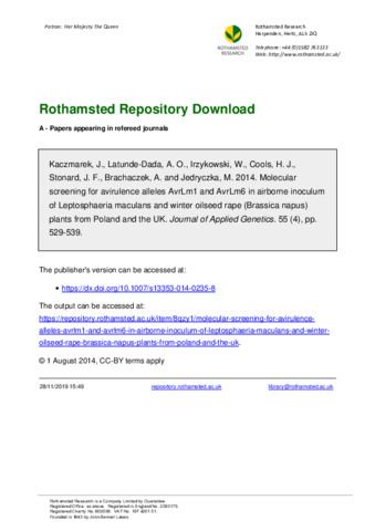 Molecular screening for avirulence alleles AvrLm1 and AvrLm6 in airborne inoculum of Leptosphaeria maculans and winter oilseed rape (Brassica napus) plants from Poland and the UK